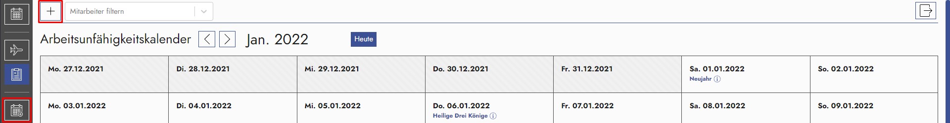 Eine Arbeitsunfähigkeit kann auch über den Arbeitsunfähigkeitskalender eingetragen werden. Der Arbeitsunfähigkeitskalender ist über das Hauptmenü verfügbar. Eine neue Arbeitsunfähigkeit wird über das “+”-Symbol eingetragen.