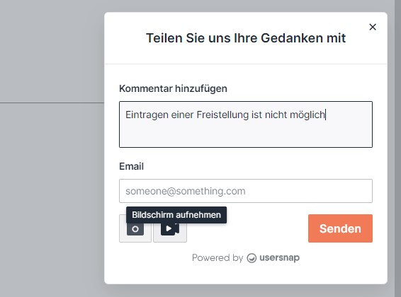 Klicken Sie auf den "Feedback"-Button, öffnet sich eine Maske, wo Sie einen Kommentar hinzufügen können. Zusätzlich haben Sie auch die Möglichkeit einen Screenshot zu machen oder ein Video zu erstellen.