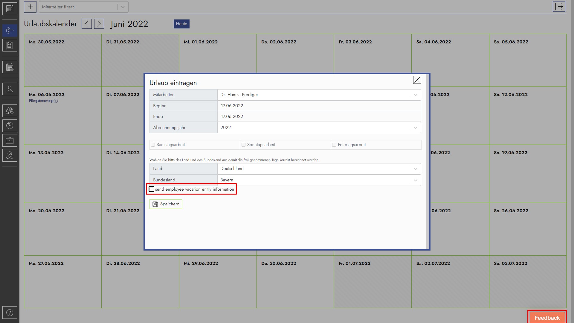 Das Abrechnungsjahr kennzeichnet das Jahr, aus welchem der Urlaub bezogen wird. Auf diese Weise können Resturlaube aus dem Jahr zuvor einberechnet werden. Das Land und das Bundesland sind für das Einbeziehen der Feiertage notwendig.