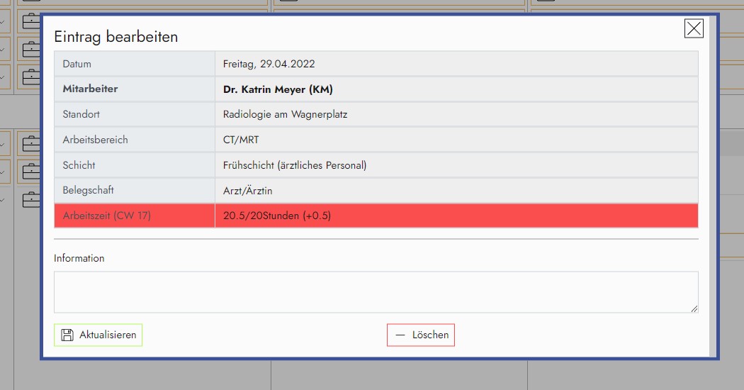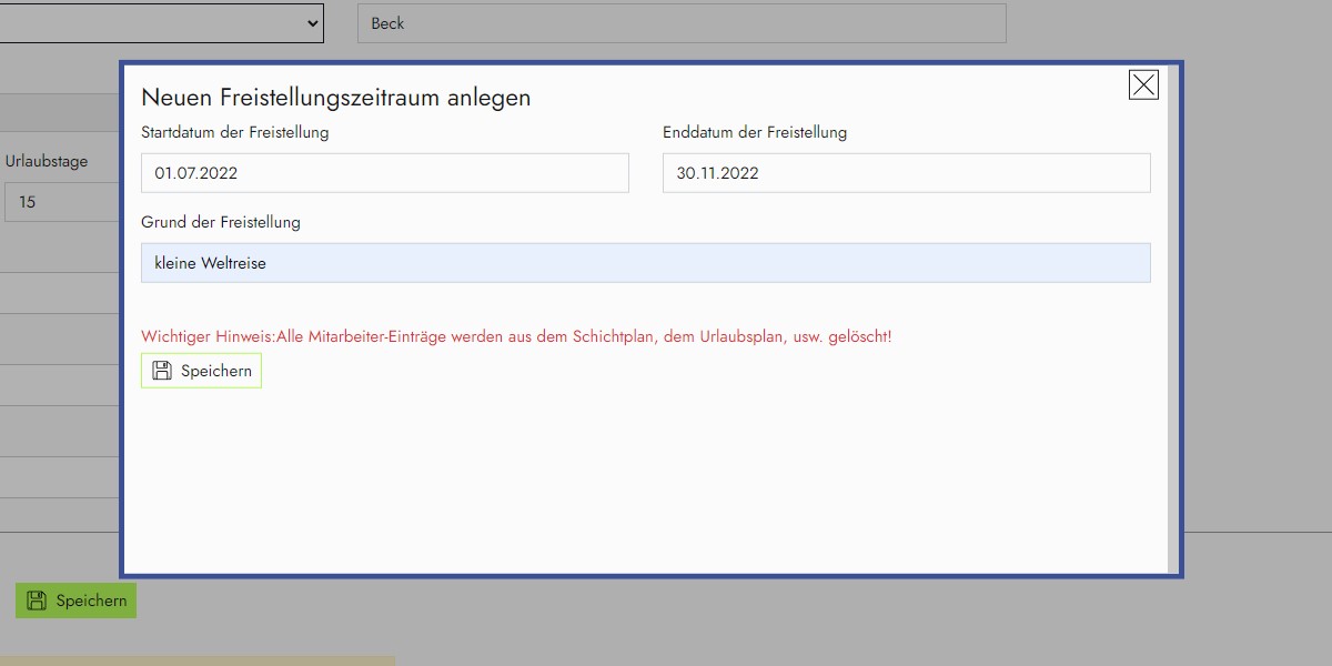 Wie bei der Eintragung von Arbeitsunfähigkeiten erfolgt auch hier keine Prüfung mit möglichen Einträgen im Schichtplan und im Urlaubskalender des Mitarbeitenden. Sowohl Schichtplaneinträge als auch Urlaubseinträge werden gelöscht.