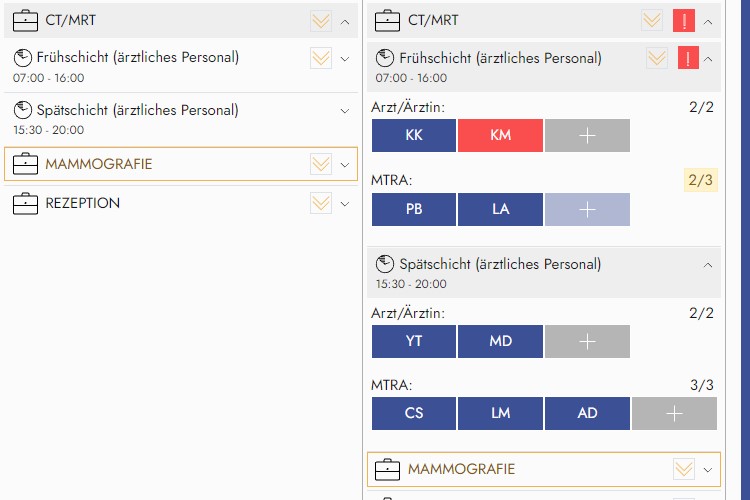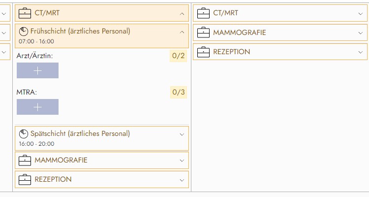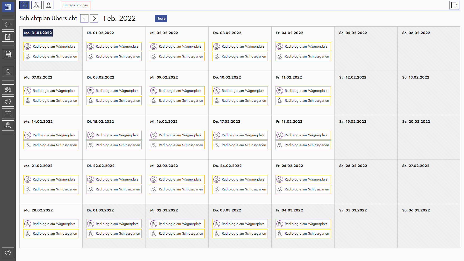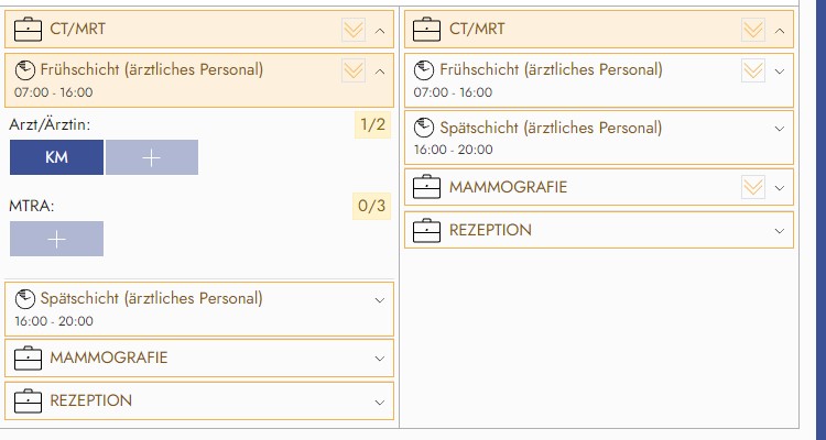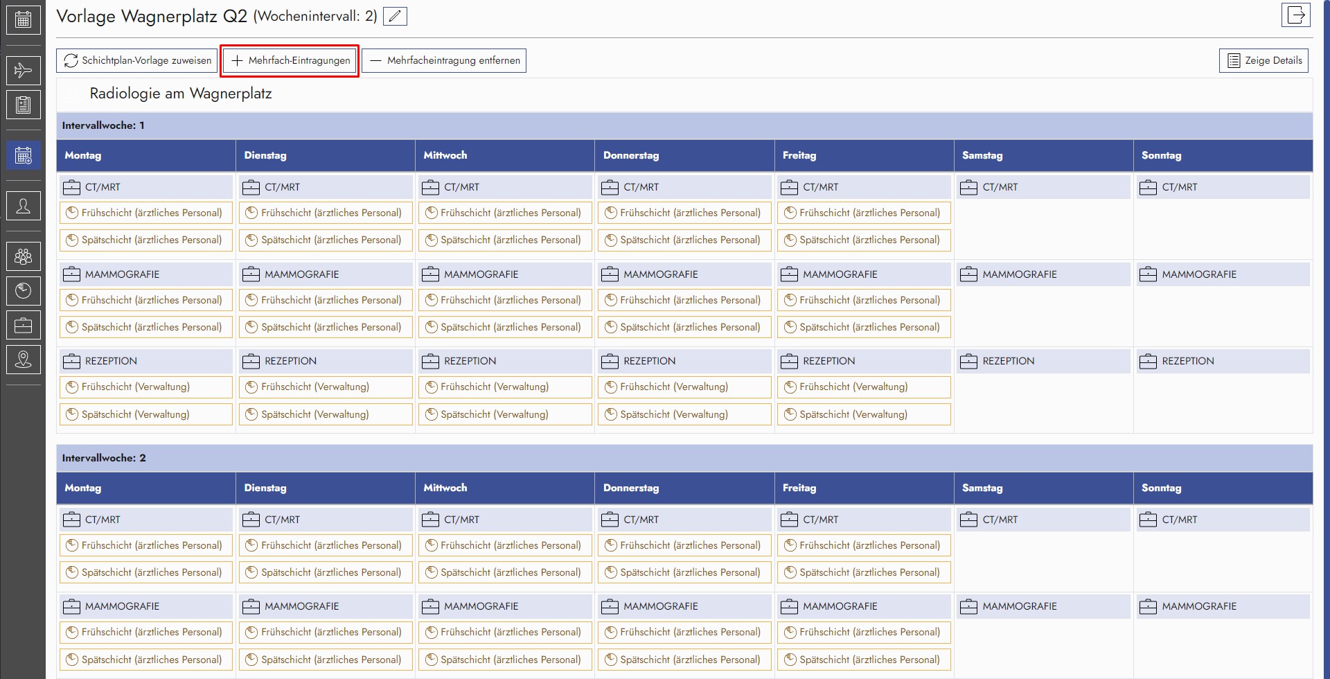 Bei der Übersicht werden die hinterlegten Informationen angezeigt, die für den Standort in den Stammdaten hinterlegt wurden: Der Standort Radiologie am Wagnerplatz ist von Mo-Fr geöffnet, hat drei Arbeitsbereiche (CT/MRT, Mammografie und Rezeption) mit jeweils eine Früh- und einer Spätschicht. Da das Intervall für die Vorlage 2 Wochen beträgt, werden hier zwei Pläne untereinander angezeigt. Per Klick auf “Mehrfach-Eintragungen” gelangt man zur Planungsübersicht: