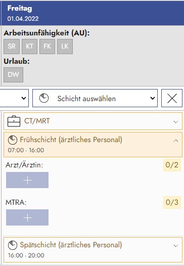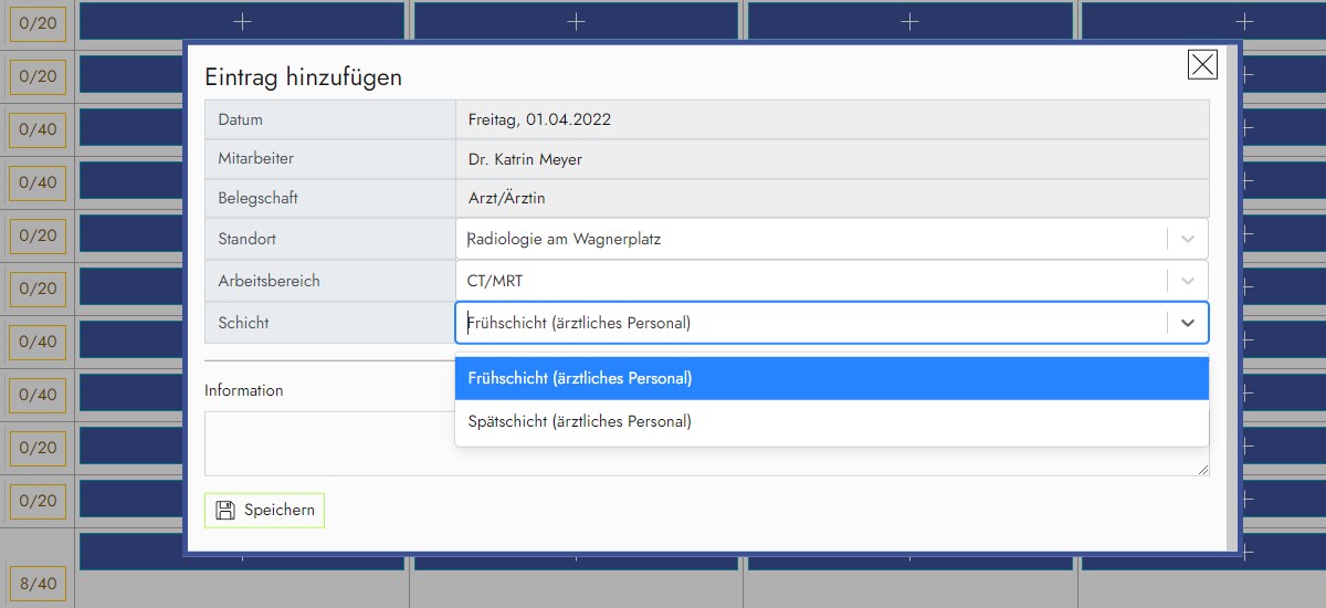 Über das “+” Symbol öffnet sich ein Menü, in dem man den Mitarbeitenden für das ausgewählte Datum einem Standort, einem Arbeitsbereich und einer Schicht einteilen kann: