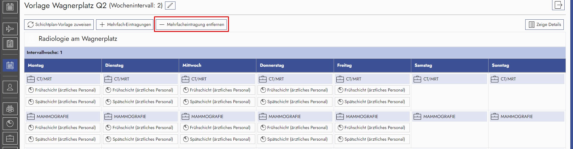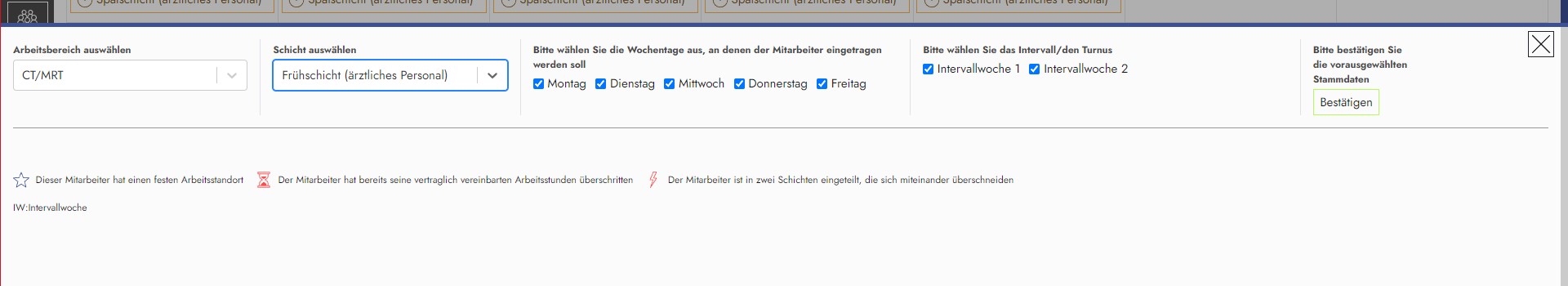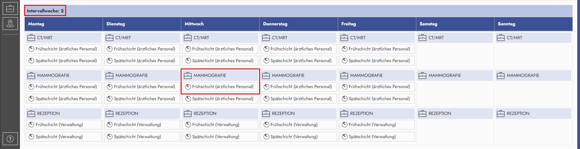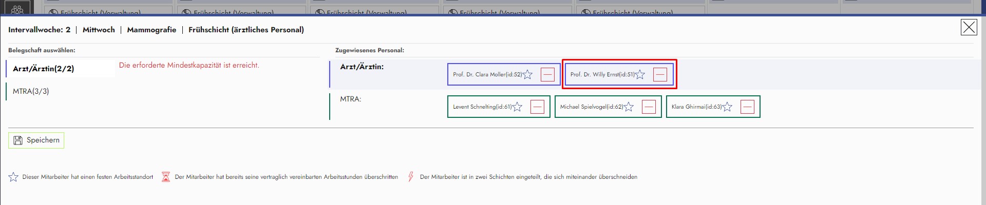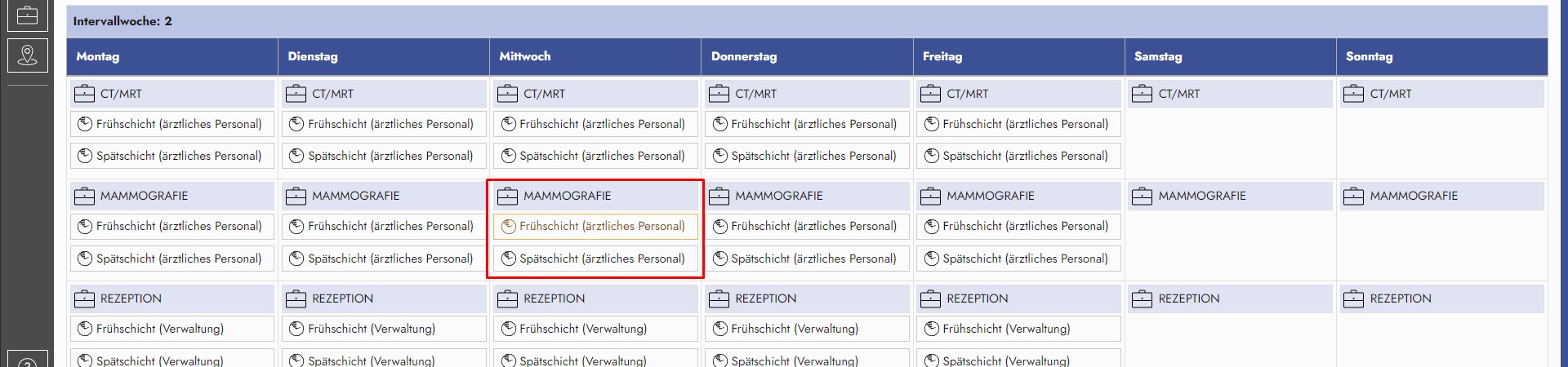 Um Herrn Prof. Dr. Willy Ernst jeden zweiten Mittwoch aus seiner Frühschicht in der Mammografie zu entfernen, klickt man in der Intervallwoche 2 auf die entsprechende Schicht und entfernt lediglich diesen Mitarbeitenden aus der Vorlage.