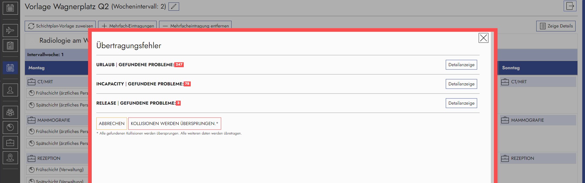 Bei der Übertragung werden die Daten im Schichtplan mit den Daten der Schichtplan-Vorlage abgeglichen. Sind bereits Einträge vorhanden, werden die Kollisionen angezeigt: