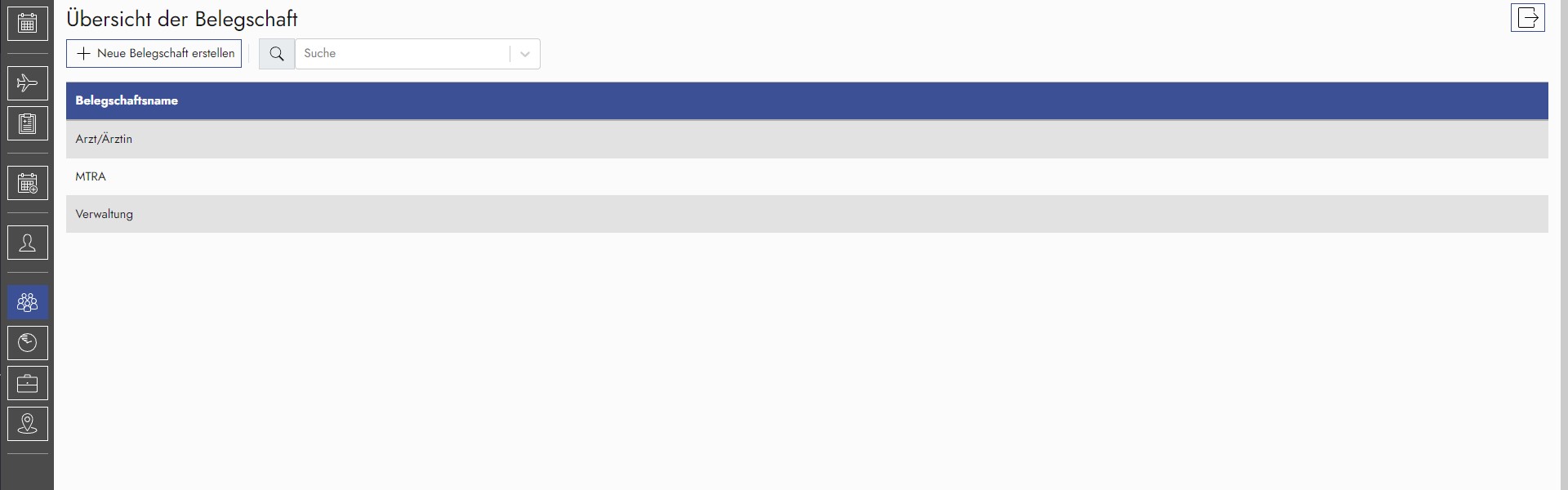 Es öffnet sich ein weiterer Abschnitt mit auszuwählenden Mitarbeitenden der einzelnen Belegschaften dieser Schicht dieses Arbeitsbereichs. Die Symbole und Farben werden weiter unten erklärt.