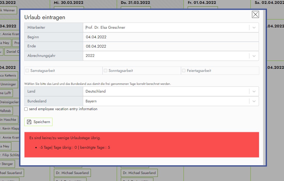 Sollten zu viele Urlaubstage eingetragen werden, erhält der Planende eine Rückmeldung, dass die Urlaubstage des Mitarbeitenden aufgebraucht sind: