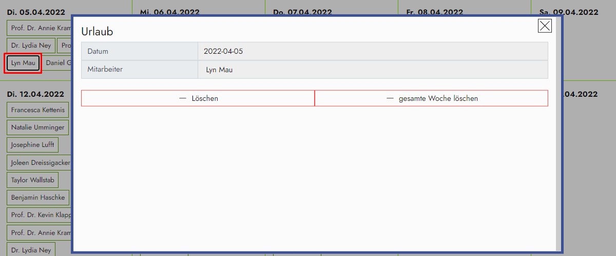 Urlaube einer Person können per Klick auf den Namen im Urlaubskalender gelöscht werden. Der Planende hat die Auswahl zwischen der Löschung des ausgewählten Tages und der Löschung einer gesamten Woche: