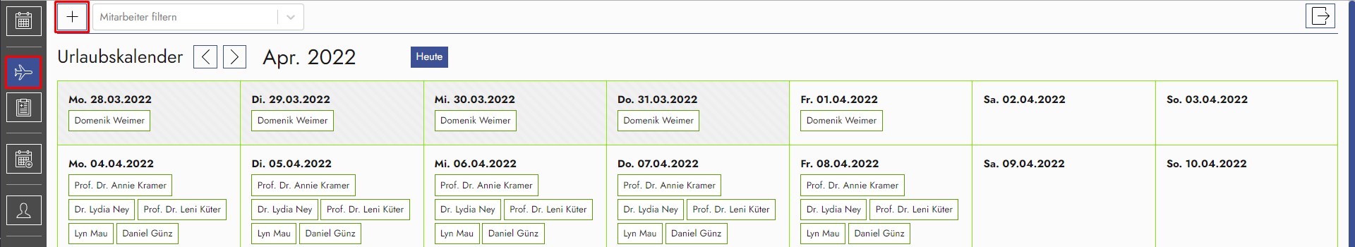 Der Urlaubskalender ist über das Hauptmenü zu erreichen. Über das “+”-Symbol kann der Urlaub eines Mitarbeitenden eingeplant werden: